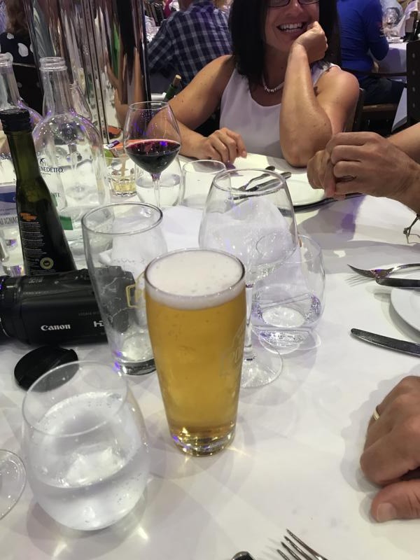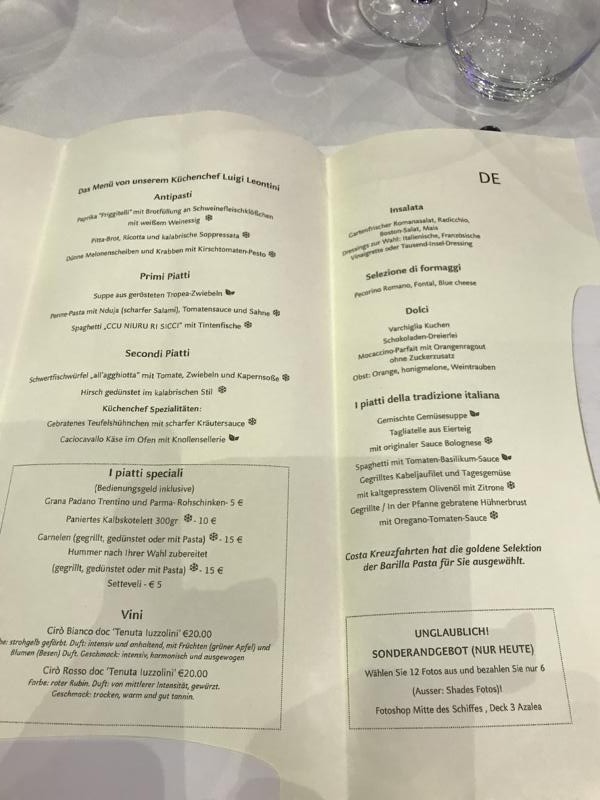 Am Nachmittag war ein bisschen Kofferpacken angesagt, am frühen Abend besuchten wir die Crew Show „Gente Di Mare“ im Theater und dann gab es das letzte Abendessen mit einem schönen italienischen Abend und oh Wunder: das Bier schaffte es vor dem Hauptgang.