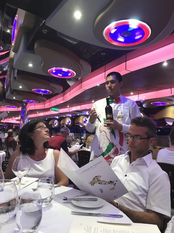 Heute Abend war Italienischer Abend angesagt.Auf dem Schiff, nicht im Hauptrestaurant. Der Ärger vom Mittag hatte zumindest bewirkt das alle Stühle da waren und auch ein Kellner der für Getränke sorgte. Der Maître schaute vorbei und wenn Blicke töten könnten…..