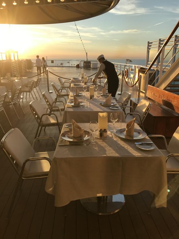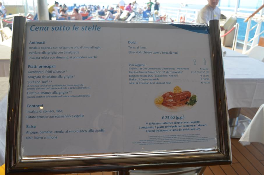 Ein Teil von Deck am Heck wurde gesperrt, dort fand jeden Abend zu Sonnenuntergang ein besonderes Dinner statt, „Abendessen unter Sternen“ zu Preis von 25€