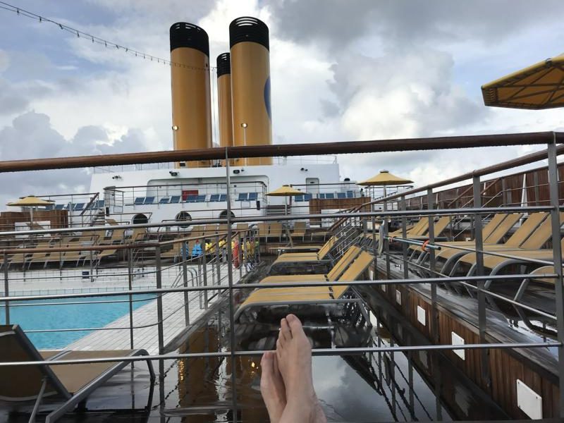 Bevor alle an Bord wollten tenderten wir zurück, genossen die Abendsonne am Pool Deck und ich tippte ein wenig Reisebericht.