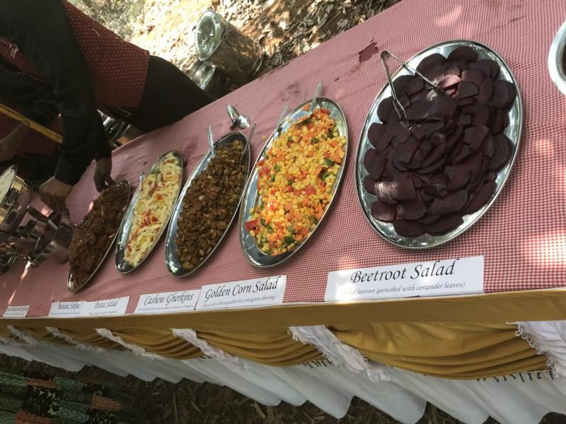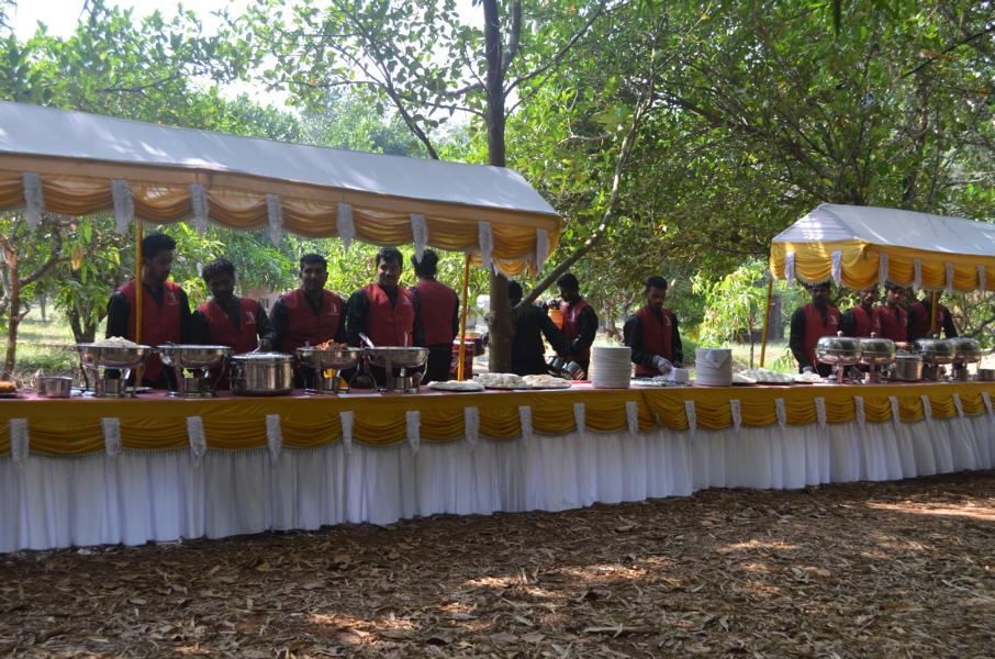 Wir wurden mit frischgepressten Ananassaft empfangen, suchten dann unsere Plätze in einem Bambusgarten auf und genossen die örtliche Küche. Es gab viel zu probieren und zu bestaunen.
