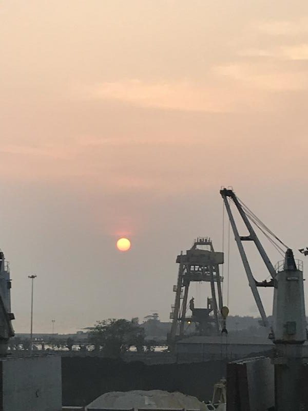 Zurück an Bord freuten wir uns auf kühle Getränke an frischer Luft, die Getränke gab es, den Smog aus Kohlestaub gratis dazu, wir waren froh abzulegen und das offene Meer zu erreichen.