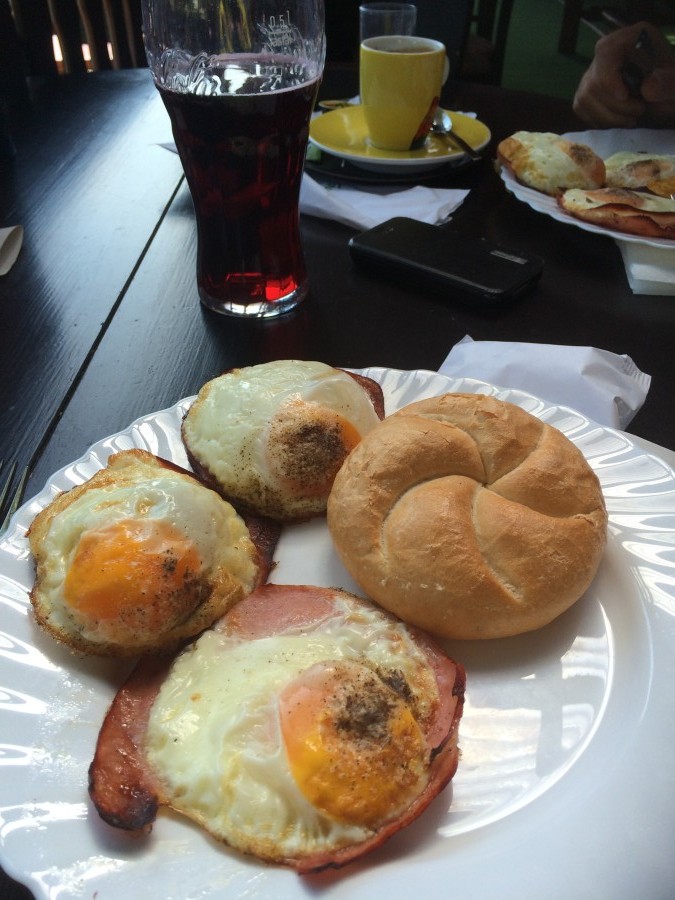 Ham&Eggs, Kaffee und freies Wlan, das entschädigte für die 30km und das lange Warten aufs Frühstück.