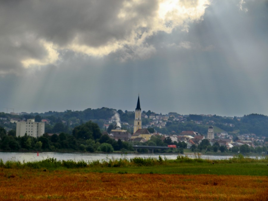 In Vilshofen wollte mein Männe ein Eis. Eine gute Entscheidung denn während dessen ging die Welt unter. Die, laut Wetterbericht, örtlichen Schauer entpuppten sich als Wolkenbuchartiger längerer Regen.