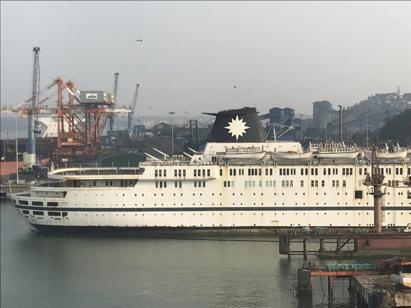 Neben uns dümpelte die ehemalige MSC Melody vor sich hin, wieder aufgerichtet aber in einem mehr als traurigen Zustand.