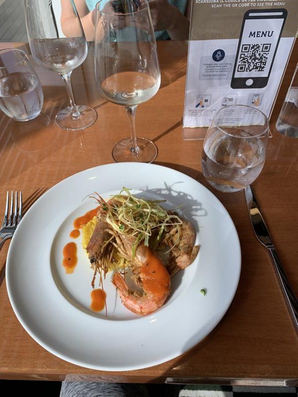Jetzt waren wir komplett und durften endlich an Bord. Auf das Einschiffungsfoto wurde verzichtet, es stellte sich heraus dass das Fototeam erst in Neapel an Bord kam. Nach der langen Autofahrt und dem Warten auf unser Testergebnis wollten wir uns bewegen und was bietet sich besser an als ein ausgedehnter Spaziergang über die Costa Smeralda. Danach schickte der Hunger uns ins Büffetrestaurant, wo im Moment auch a la carte serviert wird. Am Eingang gibt es jetzt automatische Waschbecken, wo jeder Gast die Hände gewaschen bekommt, eine coole Sache, geht schnell und effektiv und ohne kommt niemand rein. Man wird freundlich in Empfang genommen und zum Tisch geführt. Die Speisekarte ist per QR Code verfügbar, eine tolle Sache denn man lädt sich einmal am Tag alle Menüs und Getränkekarten aufs Handy und kann dann schonmal in Ruhe schauen wann und was man wo essen möchte. Wer dies nicht möchte bekommt natürlich auch eine Speisekarte gereicht. Getränkeservice war sehr gut, das Büffetrestaurant mit vielen kleinen abgetrennten Bereichen gemütlich, das Essen sehr gut, wir waren glücklich.