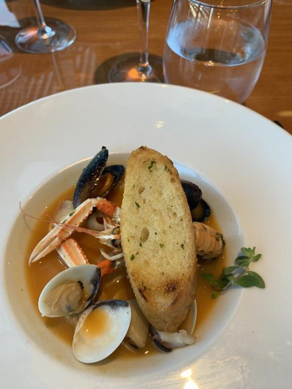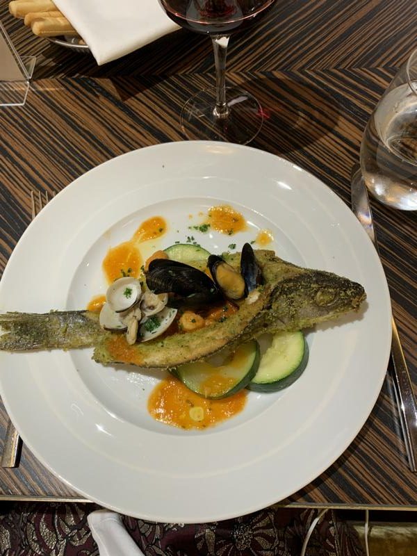 Wir hatten zum Abendessen einen Platz Im Restaurant Arlecchino, in der Mitte des Schiffes gelegen. Vergleichen mit dem normalen Angebot was es dort sonst gibt können wir nicht denn im Moment wird in allen Restaurants das gleiche Menü serviert(außer Themenrestaurants). Auch hier, wie auch in allen anderen Restaurants gibt es am Eingang die Handwäsche und danach wird man zu seinem Platz geführt. Speisekarte auch hier als QR Code, wie in allen Restaurants und Bars. Es gab keine Tischdecken, Besteck, Gläser und Servietten wurden erst eingedeckt wenn man Platz genommen hatte. Der Service ganz ausgezeichnet und nachdem auch hier in einem Teil des Restaurants mit etwa 30 Tischen nur 5 belegt wurden war das Personal fast zu schnell mit dem Servieren der einzelnen Gänge. Das Essen sehr gut, warm, alles auf dem Punkt und ausreichend Wahlmöglichkeiten.